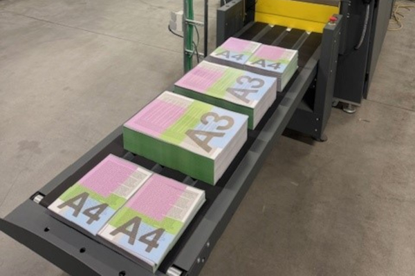 De Tecnau is een afwerkmachine die een rol drukwerk kan omzetten naar netjes gesneden eindformaten. Een belangrijk voordeel is dat de machine volledig automatisch van formaat kan wisselen, en dat binnen ongeveer een minuut. Dat betekent: minder stilstand, minder ombouwtijd en makkelijker meerdere opdrachten achter elkaar verwerken.